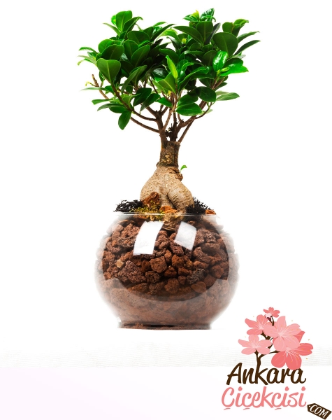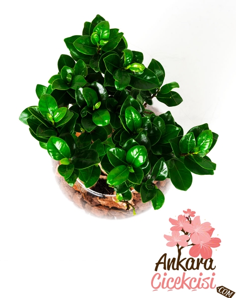 Yaklaşık 45 cm yükseklikteki Smart Bonsai’yi, Cam fanus içerisinde, Bonsai familyasından olan Ficus Bonsai